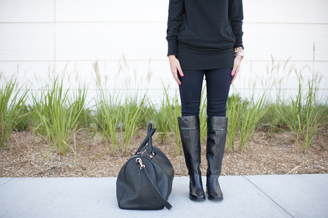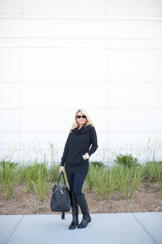 Top : Pull Over Cowl-Neck Sweater only $29 (exact is last season) | Bottoms : Jeggings | Boots :  Sole Society Kemper Tall Black Boot c/o | Weekend Travel Bag : Sole Society Lacie c/o